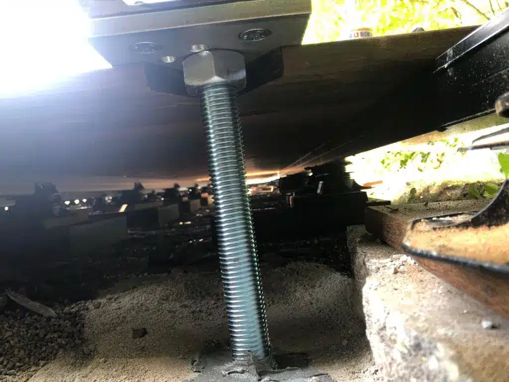 Der Aufbau ist einfacher mit Dübelplatten zu bewerkstelligen, weil man die Steher bevor man sie ausrichtet schon aufstellen kann und sie erst dann in das Fundament verschraubt. Die M12 Betonschrauben liefern wir mit. Bohren Sie dafür mit einem M10 Bohrer das Loch ins Fundament vor und ziehen Sie die Schrauben dann mit Kraft fest.