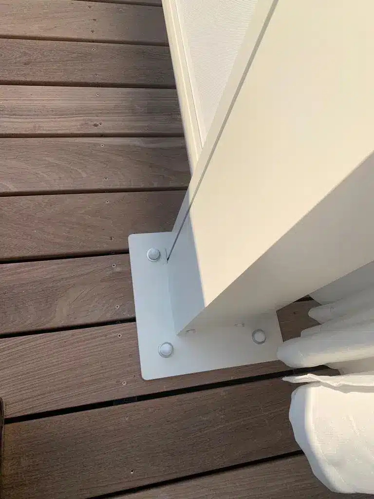 Die sturmsicher und zugfeste Verankerung ins Fundament ist der entscheidende Aufbauschritt bei der Montage des my-pergola24.com Lamellendaches.
