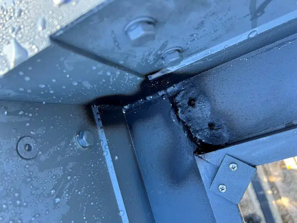- Eckverbindungen der Regenbleche (Bodenfuge, Seitenfugen und Schrauben)