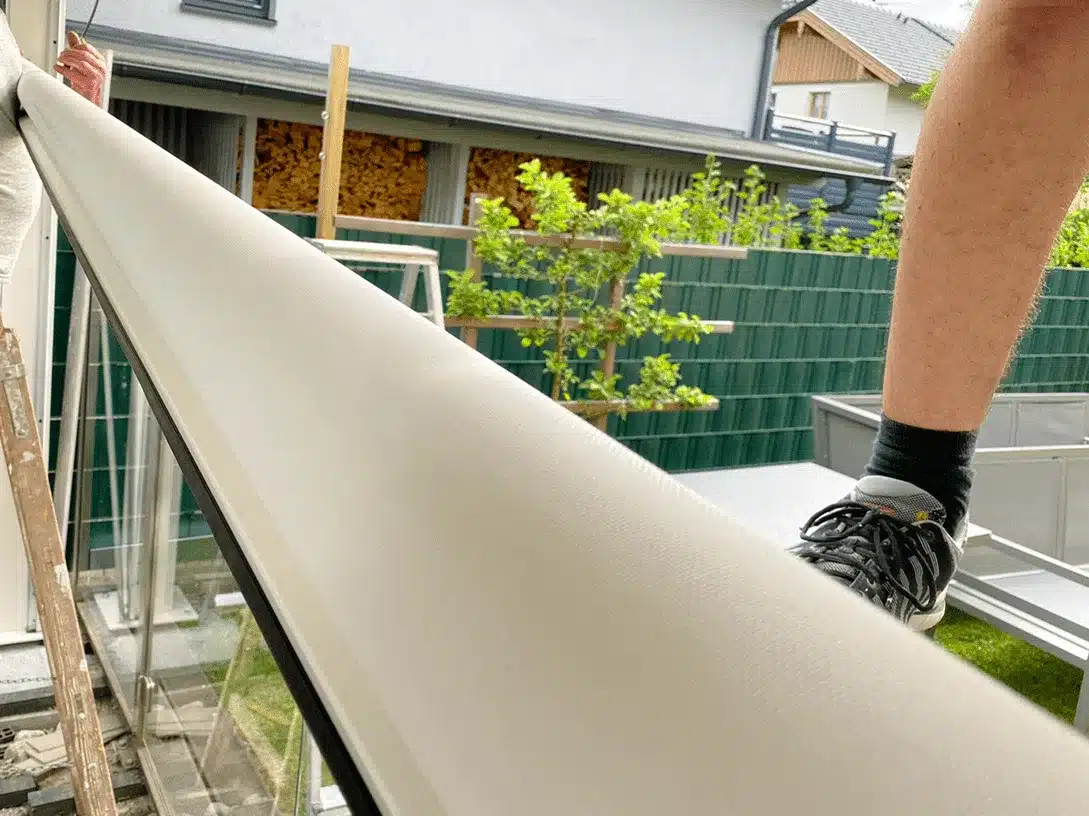 Wenn sich unter dem Zip beim Abrollen einmal etwas befindet – zb. ein Stuhl und das Zip rollt sich schräg ab oder bleibt hängen, dann nicht sofort hochfahren und schräg aufrollen. Entfernen Sie das Hindernis und drücken Sie das Zip nach unten bis es wieder gerade steht. Jetzt erst wieder aufrollen oder weiter abrollen.